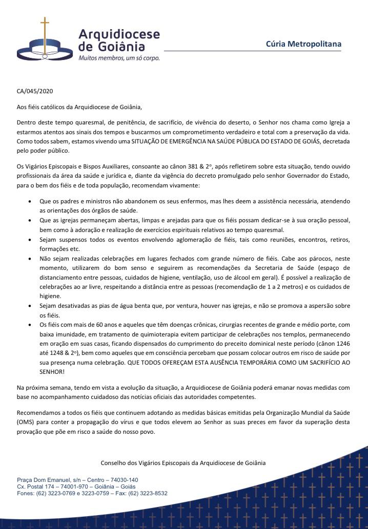 Na próxima semana, tendo em vista a evolução da situação, a Arquidiocese de Goiânia poderá emanar novas medidas com base no acompanhamento cuidadoso das notícias oficiais das autoridades competentes.